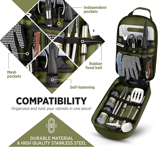 போர்ட்டபிள் வெளிப்புற முகாம் கருவி பை, ஒவ்வொரு பாத்திரத்திலும் அதன் சொந்த நியமிக்கப்பட்ட பை உள்ளது, எனவே அலகுகள் சேமிப்பதில் அல்லது போக்குவரத்தில் அல்லது சேதமடையாது. உங்கள் சமையல் பாத்திரங்களுக்கு எளிதாக அணுகலை வழங்குகிறது, மேலும் இது பாதுகாப்பான ஜிப் முத்திரையுடன் பொருத்தப்பட்டுள்ளது