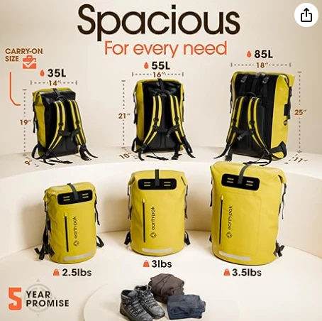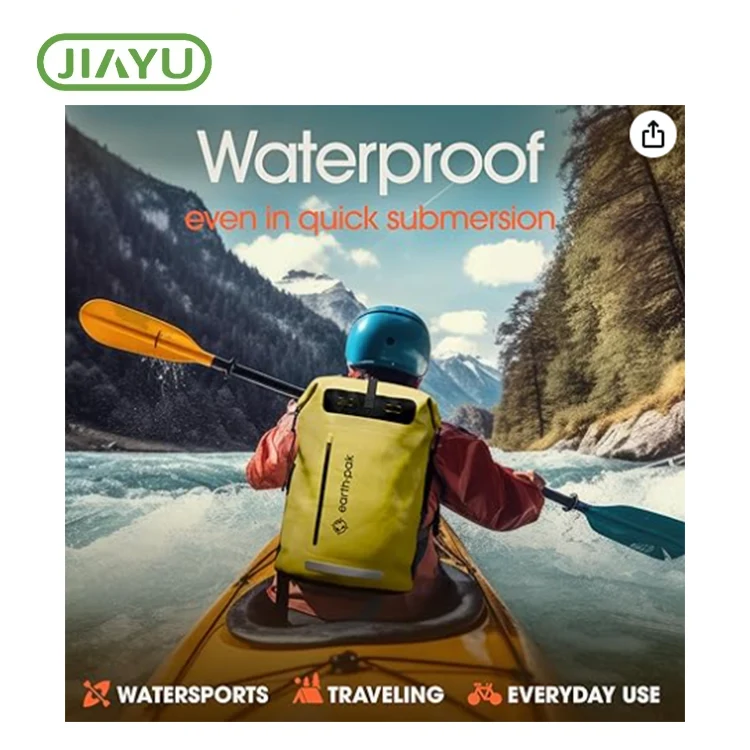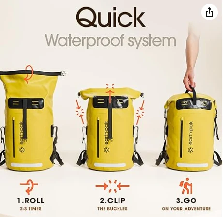 நீர்ப்புகா உலர் பையுடனும் டஃபெல் பை. பையின் உள்ளேயும் வெளியேயும் பாக்கெட்டுகள் பொருத்தப்பட்டுள்ளன. விரைவான கிராப் மற்றும் கோ பொருட்களுக்காக வெளியில் ஒரு பெரிய ஸ்பிளாஸ்-ப்ரூஃப் ஜிப்பர், மற்றும் ஒரு உள்ளமைக்கப்பட்ட சிப்பர்டு பாக்கெட், மெஷ் பெட்டியின் மற்றும் முக்கிய மோதிரம் உள்ளே உள்ளது. தோள்பட்டை பட்டைகள் மற்றும் மோல் சிஸ்டம் சுழற்சி ஆகிய இரண்டிலும் இணைக்கப்பட்ட வசதியான டி-மோதிரங்கள் இரண்டும் படகு அல்லது பைக்கிங் செய்யும் போது நங்கூர புள்ளிகளை வழங்குகின்றன.